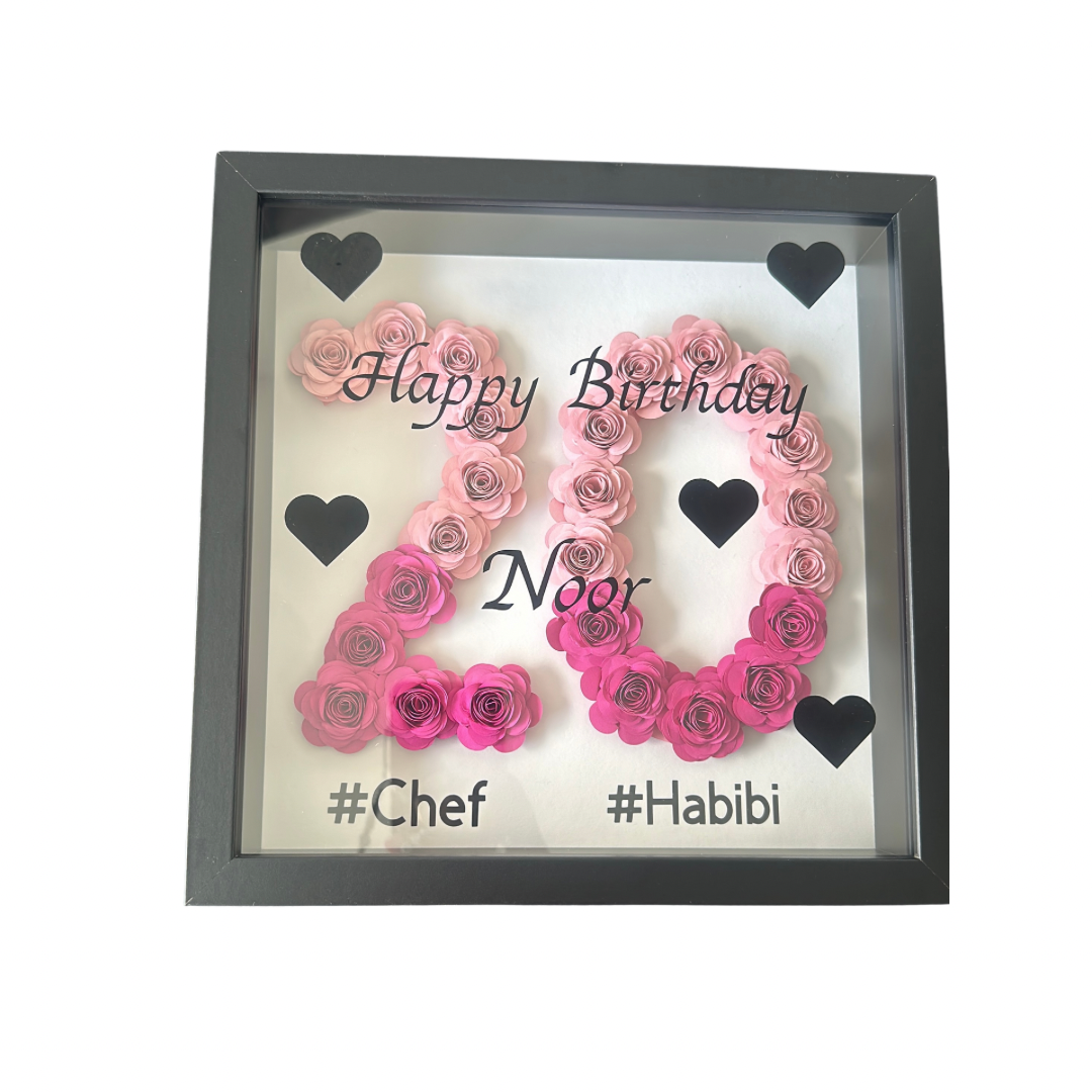Personalisierter Holzrahmen mit handgefertigten Papierrosen und Geburtstagszahl